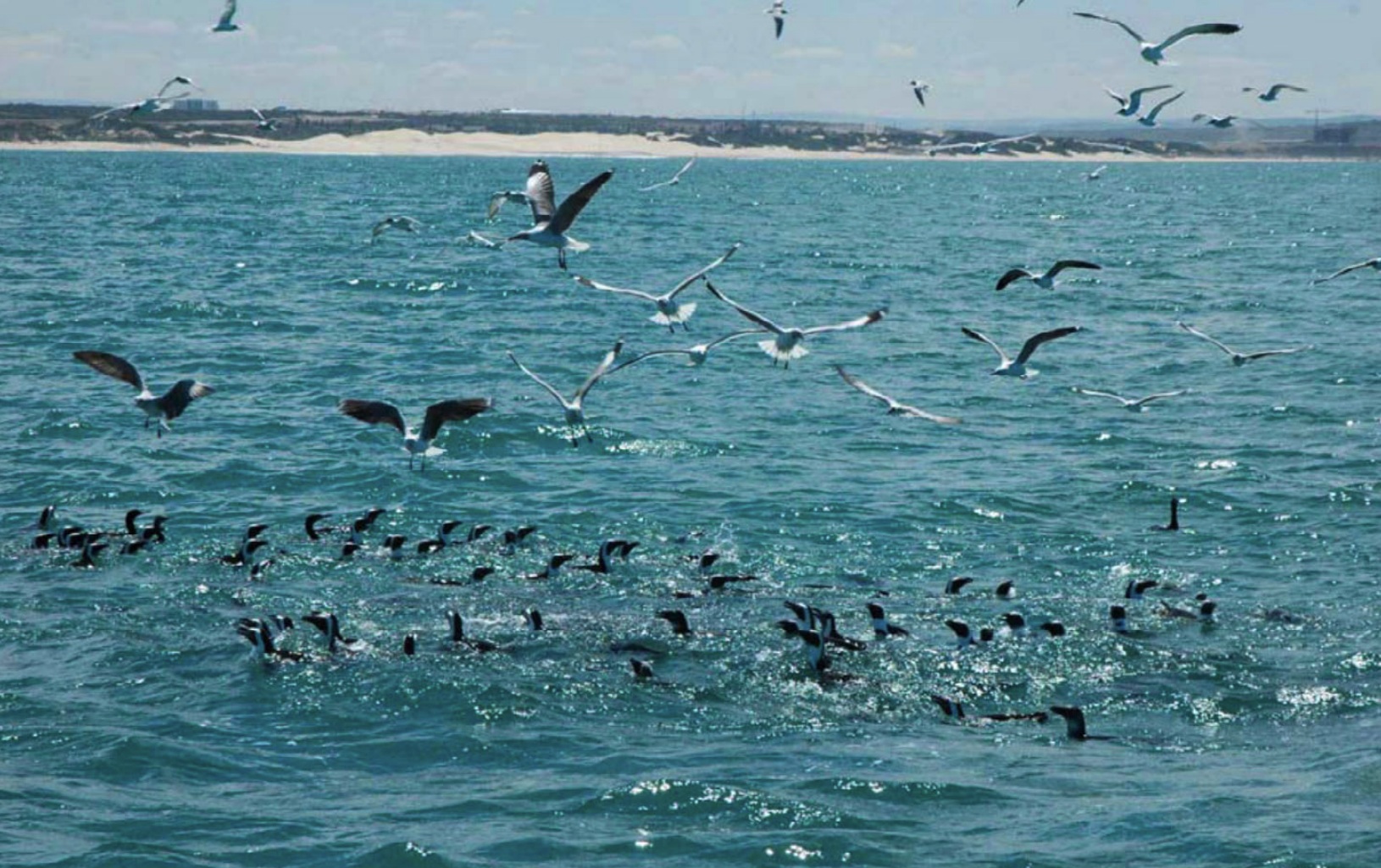 sometimes move toward the surface. In this photo, other seabird species have joined the penguins to forage on the fish near