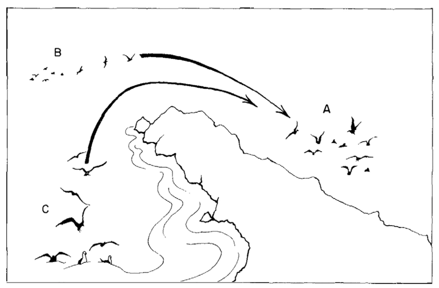 Evans, R. M. 1982. Foraging-flock recruitment at a Black-billed Gull colony: implications for the information center hypothesis. Auk 99:24-30.