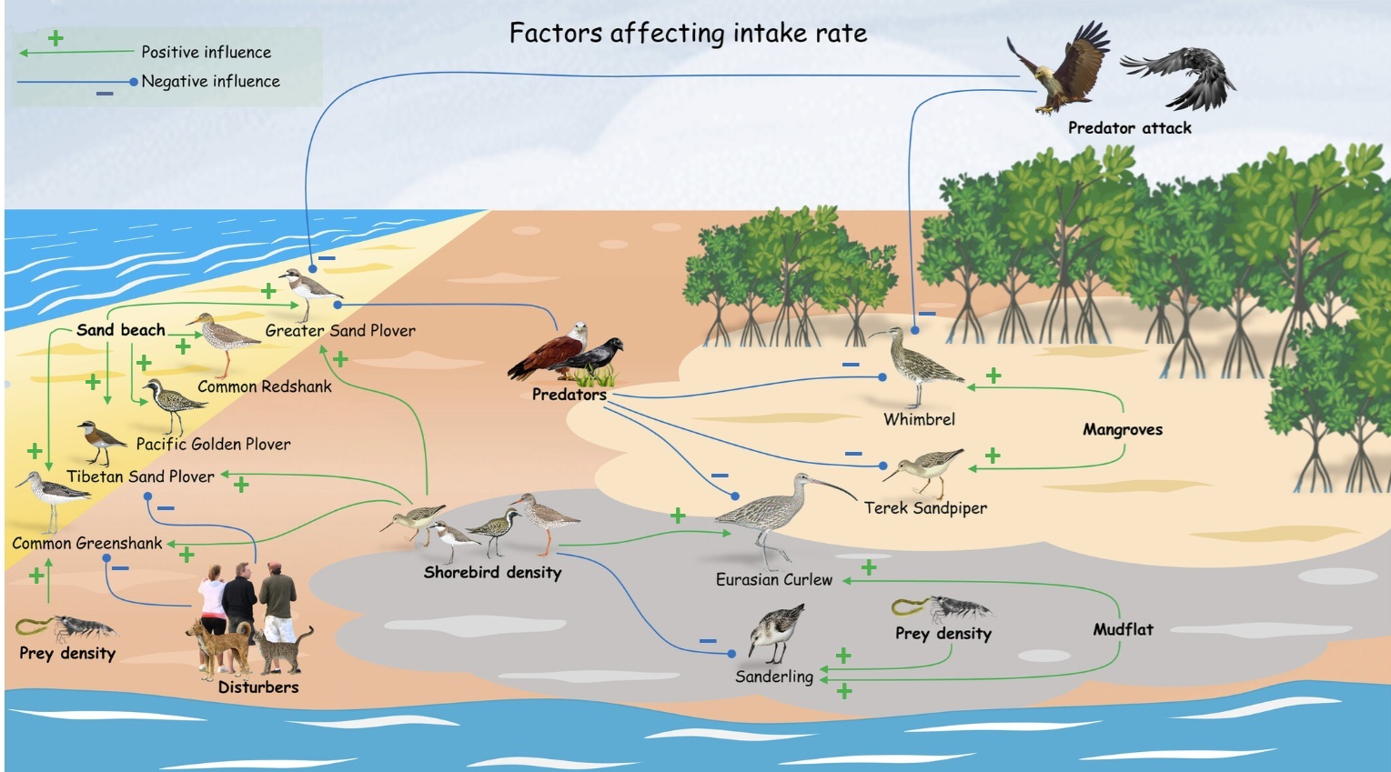 beaches. Other habitats with positive effects on intake rates included mangroves (Whimbrels and Terek Sandpipers) and mudflats (Eurasian Curlews and Sanderlings).