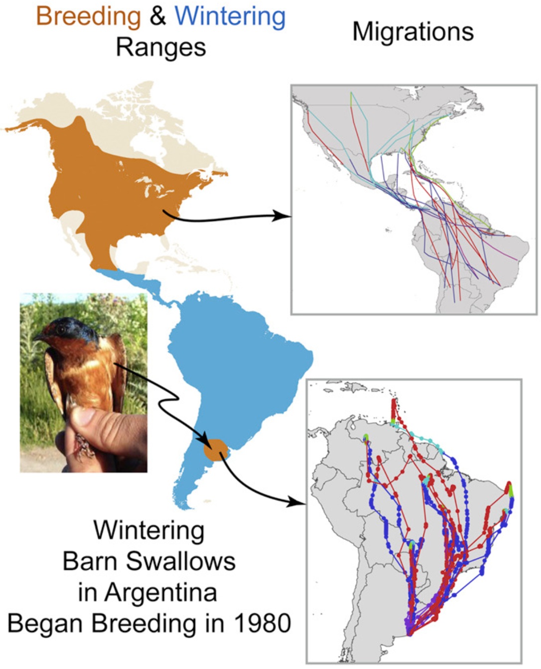 Barn Swallows (Hirundo rustica) are globally distributed passerines. Breeding populations in North America generally migrate to wintering sites in South America. However, some Barn Swallow expanded their breeding range an exceptional 7,000 km and, in the early 1980's, began breeding in their regular wintering range in Argentina. Trans-hemispheric breeding attempts have occurred previously in related species of swallows, but only this colonization has persisted. Comparative studies of birds show a remarkable diversity in patterns of change in migratory habits, and these Argentine-breeding swallows might retain ancestral patterns, breeding in Argentina but returning to North America for the austral winter. However, feather isotopes from these birds indicated that they migrate no farther than northern South America. This was confirmed by the results of a solar geolocator study. Thus, this relatively new population of Barn Swallows breeding in Argentina have rapidly changed their movements to migrate no farther north in austral winter than northern South America. In addition, these Argentine Barn Swallows are now following a migratory pattern and choice of wintering areas that is very much like that of other migrant birds from the temperate zone of South America. These Barn Swallows provide evidence that migration is flexibly responsive to an array of environmental cues, making it able to change without the need for underlying genetic change. The rapid change in migration observed in the Argentine Barn Swallows is likely due to phenotypic changes that did not require large changes in the frequencies of associated genes (From: Winkler et al. 2017).