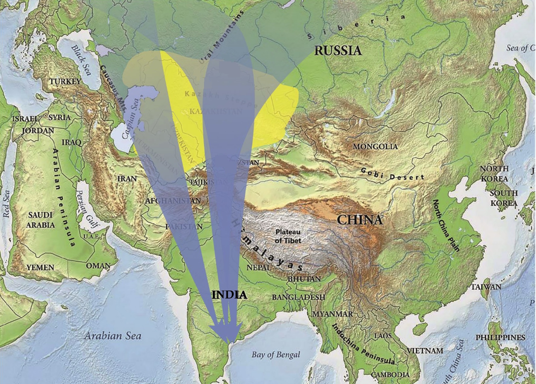 yellow = spring (return) migration (April–May). Two southbound migration routes were adopted in the South Atlantic,