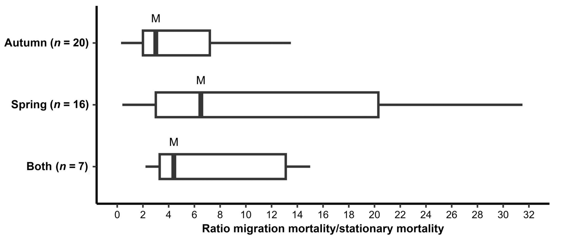 spring migration (n = 16), or both migrations combined (n = 7). M = median value, blocks indicate 25% of studies above and below the median, and