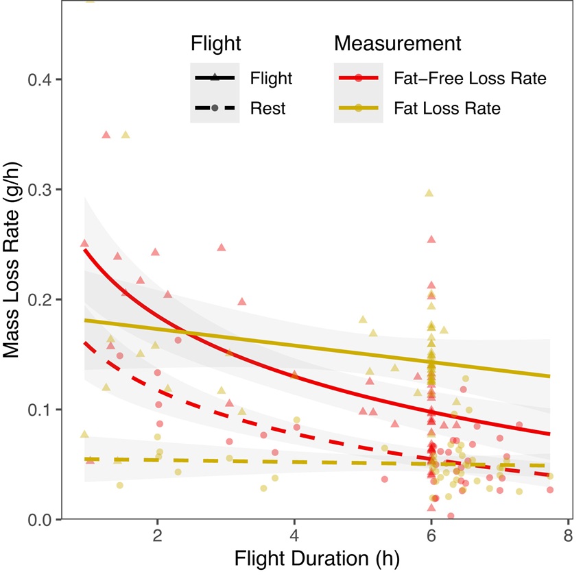 and fat-free mass loss is shown in red, with birds in flight shown with solid lines/triangles