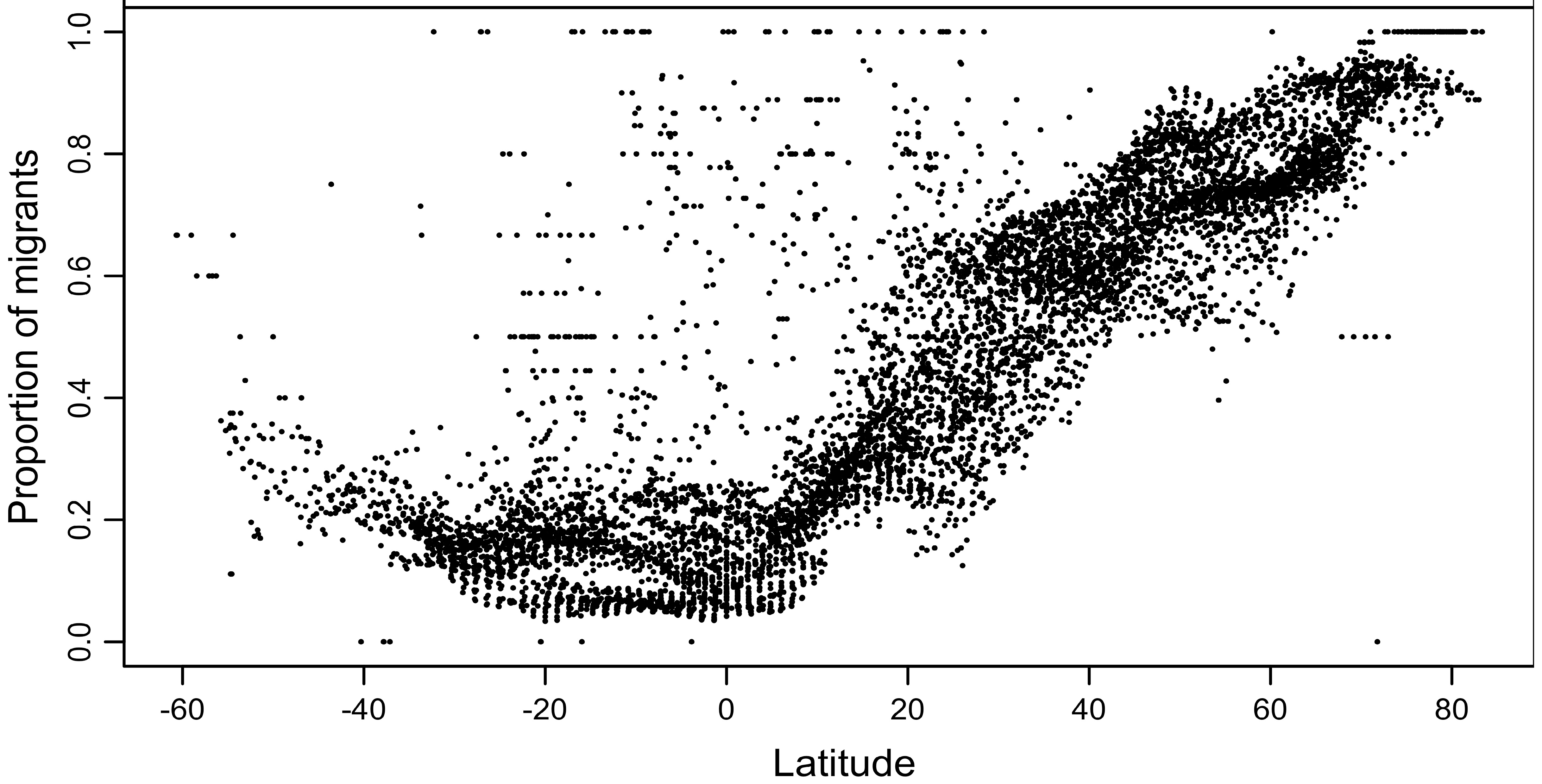 The proportion of migratory species is generally low south of the equator (generally <25%,