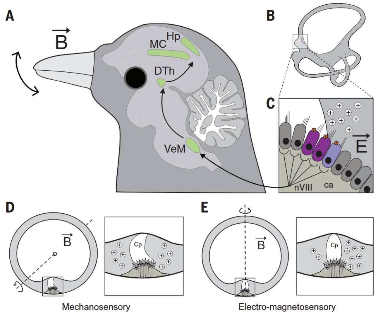 Neural correlates of a magnetic sense -- Wu and Dickman (2012) have shown that single vestibular brainstem neurons encode the direction, intensity, and polarity of an applied magnetic field in pigeons; consistent with a ferrimagnetic particle receptor, as opposed to a radial-pair cryptochrome mechanism. These findings demonstrate that MR neurons (vestibular brainstem neurons) are most sensitive within an intensity range that is naturally produced by the Earth’s magnetic field, a necessary condition for a magnetoreception system to be useful in the derivation of geopositional information. However, the Earth’s magnetic field varies over time (e.g., a 35% decrease in strength over the last 2000 years), so it would seem likely that magnetoreception systems adapt through evolution and/or developmental plasticity to the slowly changing fields in order to maximize magnetic sense perception. It is likely that MR neurons receive magnetic information from the inner ear lagena; however signals from the beak and/or retina are also possible. As MR neurons are located in the vestibular nuclei, multimodal integration of magnetic and linear acceleration cues could provide geomagnetic information relative to the fixed constant of gravity. If so, magnetoreception neural constructs would remain stable in a space-fixed reference frame, regardless of head position. Wu and Dickman suggest that MR cells encode a geomagnetic vector that could be used by the neural population to computationally derive the bird’s position and directional heading. The geomagnetic vector elevation component could provide the bird’s latitude, the vector azimuth component could be used as a magnetic compass to provide heading direction, and the vector magnitude could provide spatial position cues through local variations in intensity relative to a learned internal model of geomagnetic space. How MR cell information is used for orientation and navigation remains to be discovered, but these findings demonstrate a direct neural substrate underlying a magnetic sense in the avian brain.